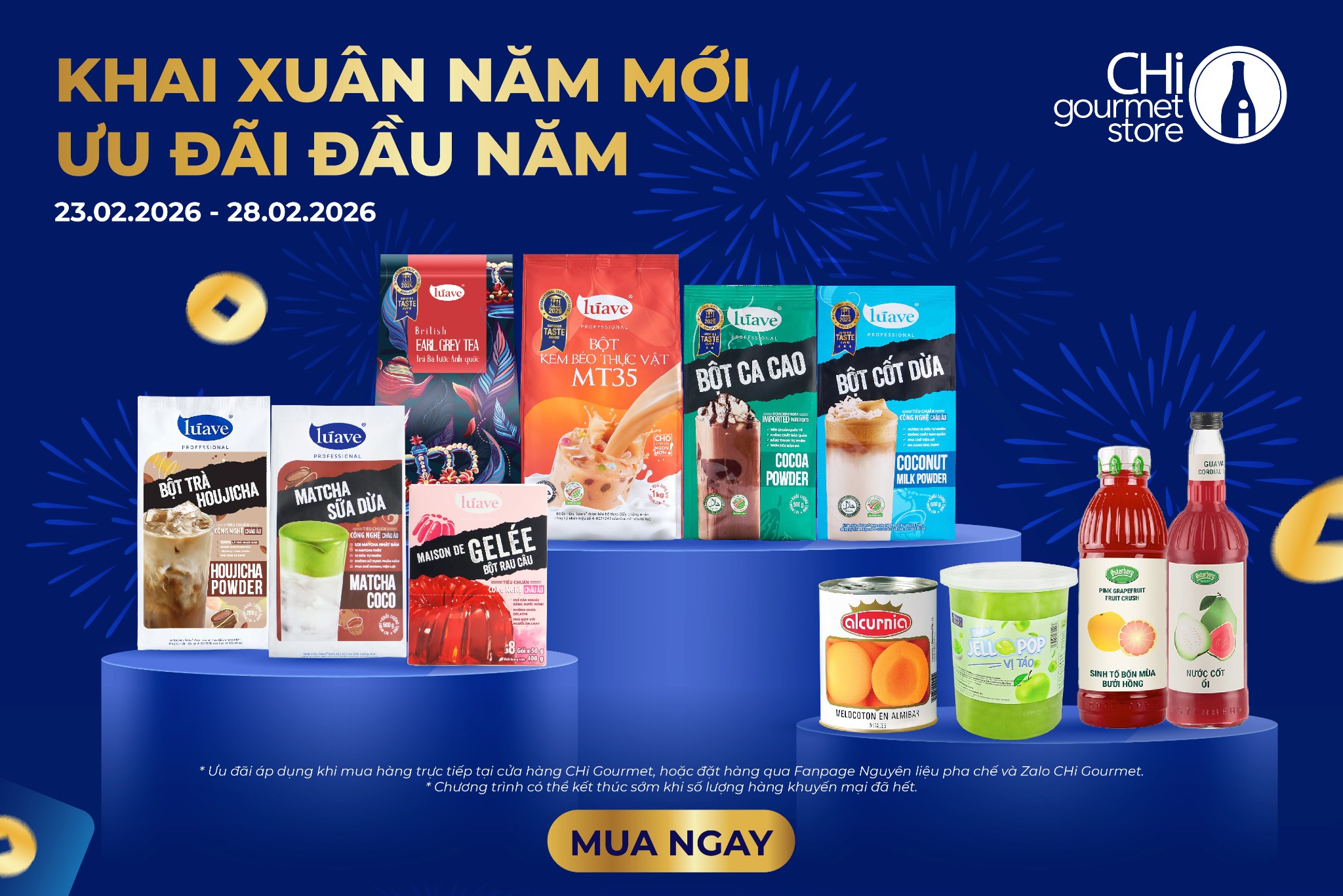 Nhằm tri ân khách hàng nhân dịp đầu xuân năm mới 2026, Chi Gourmet Store triển khai chương trình khuyến mại đặc biệt dành cho các dòng nguyên liệu pha chế với nhiều sản phẩm hấp dẫn từ các thương hiệu Lúave, Hùng Chương và Osterberg, ... mang đến thêm lựa chọn chất lượng cho khách hàng kinh doanh và tiêu dùng.