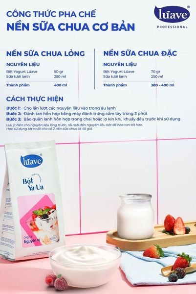 Với thành phần nguyên liệu trên, bạn sẽ có thể dễ dàng pha chế 380-400 ml nền sữa chua dạng đặc, thích hợp dùng làm sữa chua ăn thông thường hoặc các món thức uống đá xay mát lạnh, nền sốt sữa chua trên bề mặt bánh kem/ cupcake,...