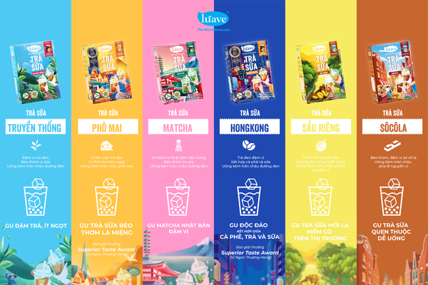 Trà sữa hòa tan Lúave hiện có 6 hương vị đặc trưng: Truyền thống, Phô mai, Matcha, Hong Kong, Sầu riêng , Sô cô la; phù hợp với thị hiếu người tiêu dùng Việt. Đặc biệt, trong mỗi gói bột trà sữa hòa tan Lúave còn không chứa chất ngọt tổng hợp và không có chất bảo quản.
