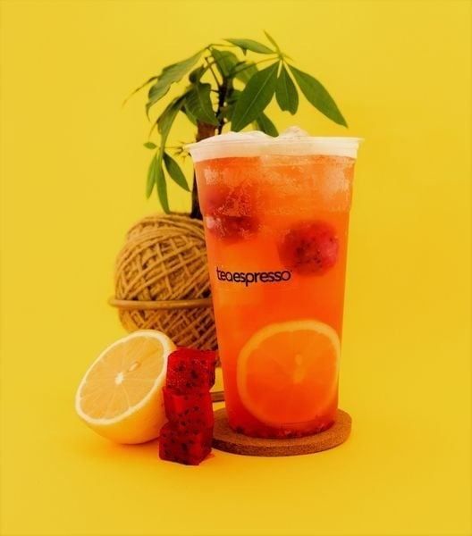 Bước 3: Rót hỗn hợp trà lên trên, trang trí ly với thanh long đỏ và chanh vàng