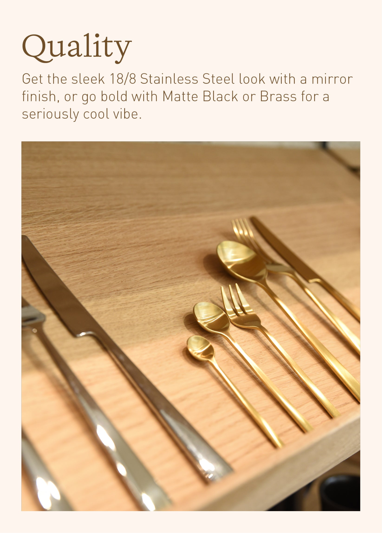 Get the sleek 18/8 Stainless Steel look with a mirror finish, or go bold with Matte Black or Brass for a seriously cool vibe.Effortlessly chic and versatile, this timeless design is ideal for any occasion, whether it's your daily routine or a special event. Handle and tip perfectly balanced, no more clumsy cutlery.